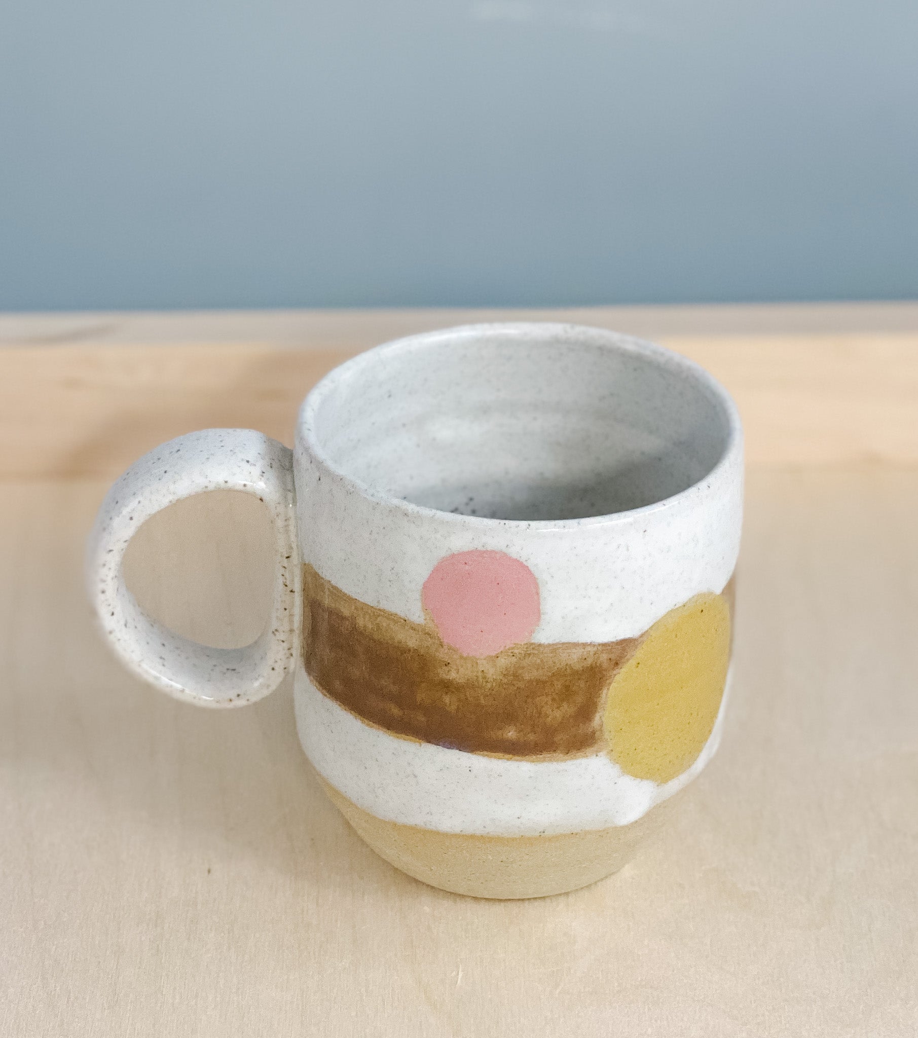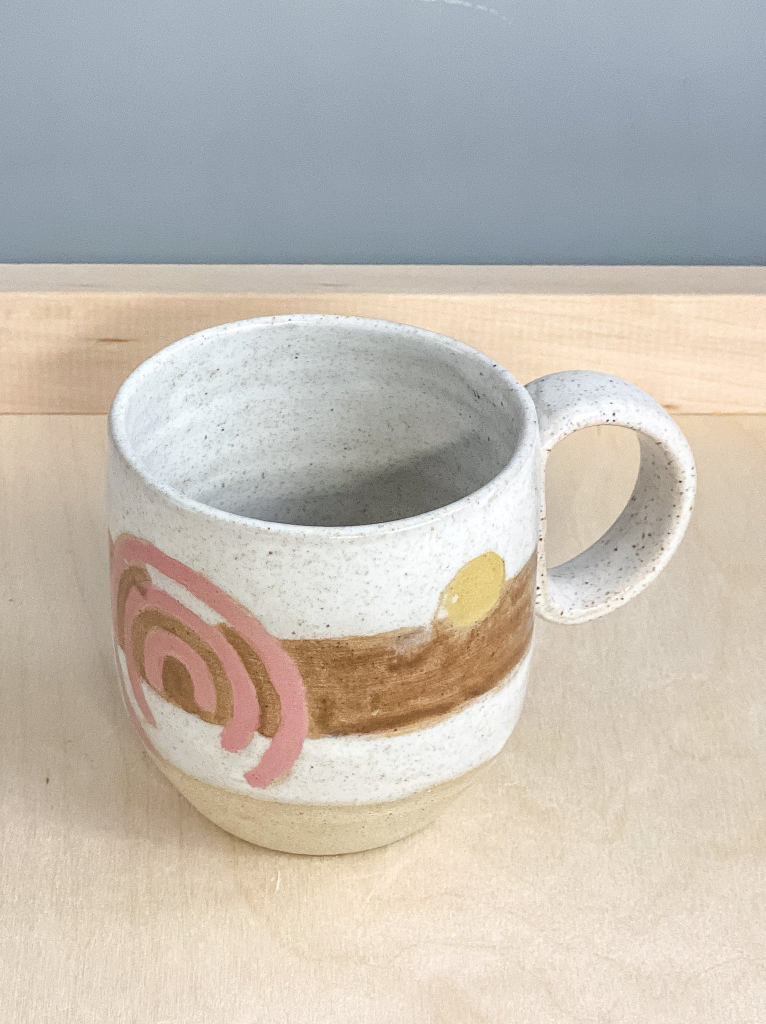 This large mug features a geometric design in brown, pink and ochre. The mug is finished with a speckled white gloss glaze.