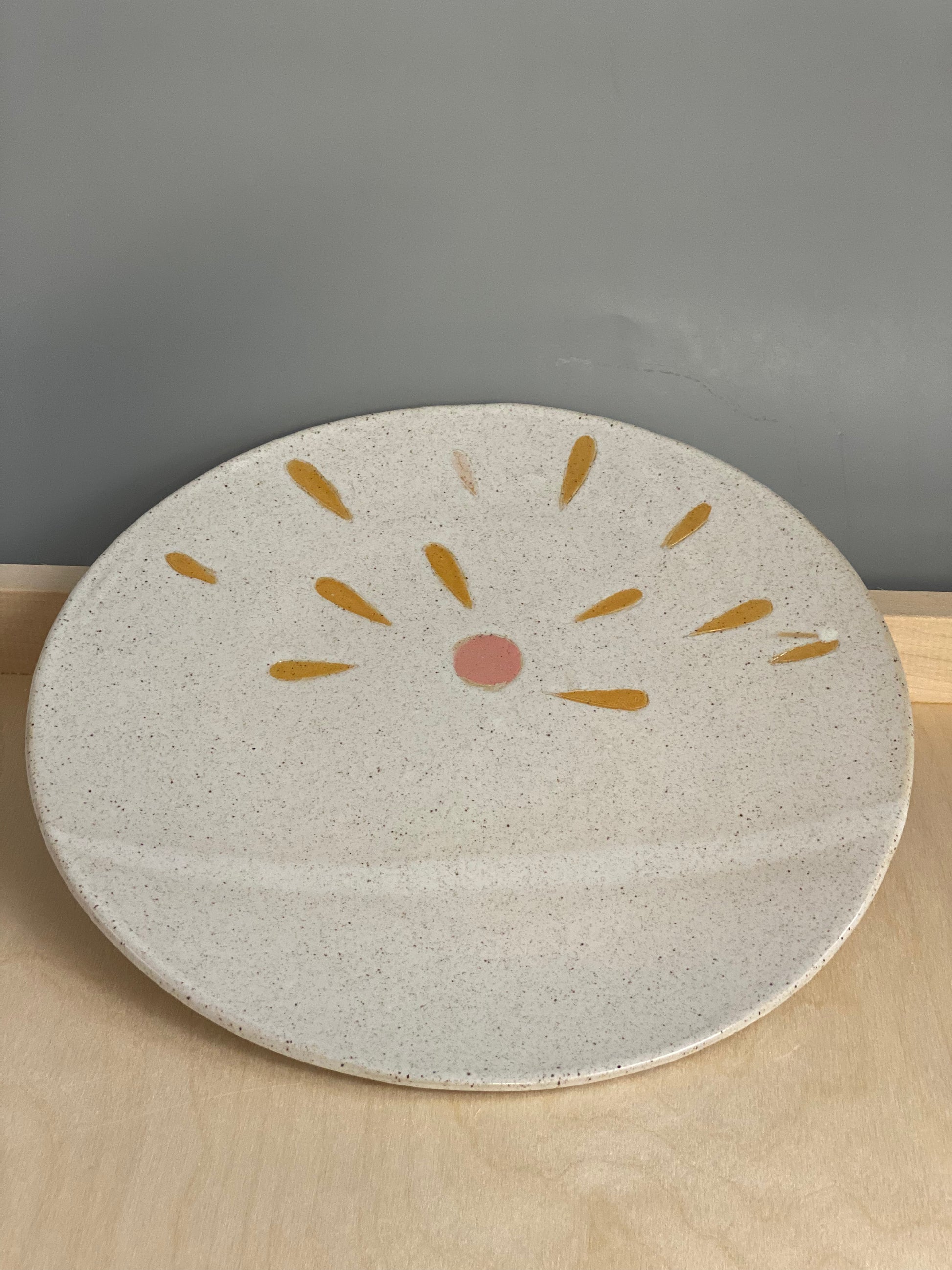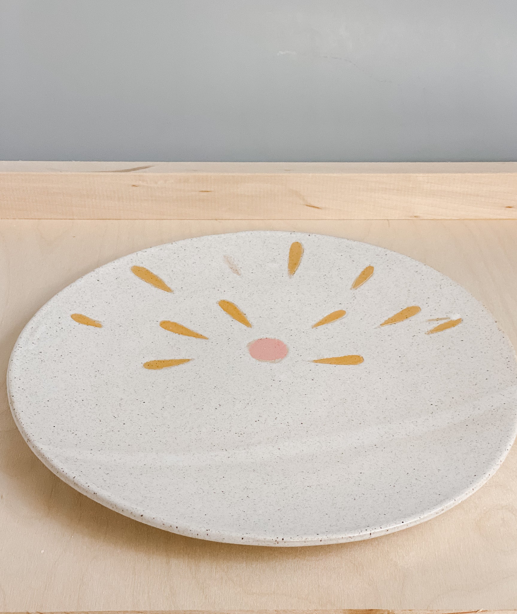 Lovely buff stoneware platter decorated with abstracted botanical shapes in yellow and pink. The platter is finished with a speckled white gloss glaze.